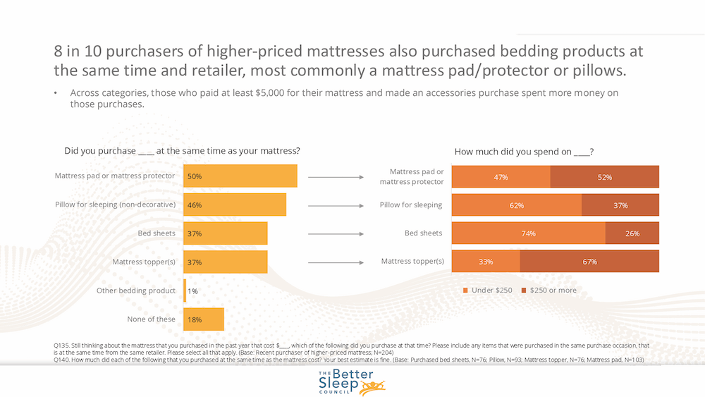A brand new basis was on the prime of many customers’ lists. Of those that lately bought a higher-priced mattress, 33% purchased an adjustable base. The proportion is greater for individuals who spent greater than $5,000 — 44%. And 33% purchased a brand new field spring or basis.